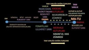 MUTLAK YOKLUK’UN KENDİ SONSUZ – SINIRSIZ MUTLAK KEYFİYETLERİ İÇERİSİNDEKİ SEYRİ; KENDİNDEN AYRI OLMAYAN MUTLAK VARLIĞININ YAŞAMIDIR. İŞTE BU YAŞAMIN KESRETTEKİ GÖRÜNÜŞÜ ZERRELER ARASI FAALİYET HALİNDE CEMADİ, NEBATİ, HAYVANİ, BEŞERİ YAŞAM FAKTÖRLERİ TARZINDA ZUHUR EDER. KESRETTEKİ BU ZERRELERİN SEYRİ İNSAN-I KAMİLE DOĞRUDUR.