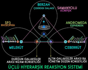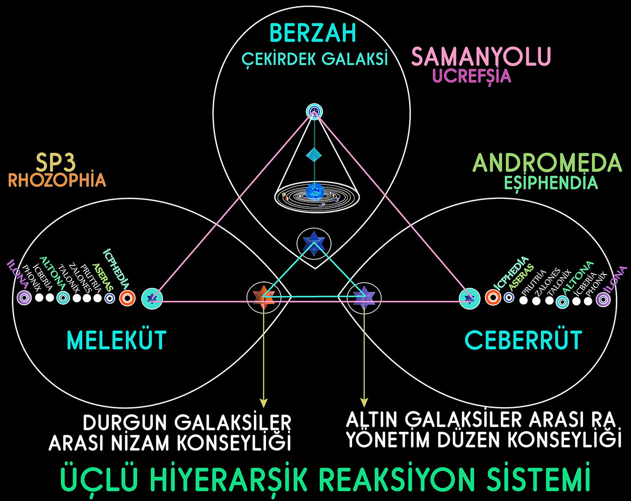 Allah Sistemi’nin Resuliyet veçhesiyle alakalı tasarruflar, Rabsal Terminolojik Sisteme uygun ifadelerle Ceberrüt Alemi ile Meleküt Aleminden müteşekkil İlahi Tasarruf ortamında enerjetik yaşam kolonilerinde yaşayan Santifer, Dorçede ve Khamon karakterlerine sahip Enerjetik Yaşam Üniteleri tarafından yapılmaktadır. Ceberrüt ve Meleküt alemleri olarak tanıtılan ortam, iki galaksiden müteşekkil olan Galaktik Yaşam Platformudur. Sözü edilen bu galaksilerden birisi Andromeda diğeri Shapley-3’tür. Altın ve durgun titreşim uzay / zaman boyutsal keyfiyetlere sahip olan bu ortamdaki ilahi güçlerin direkt temerküz mahali SAMANYOLU GALAKSİSİ’ dir.
